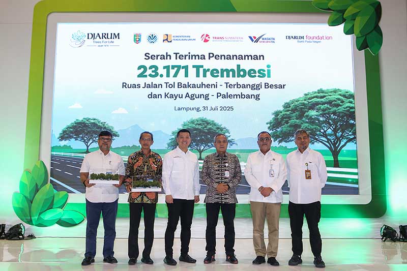 Lampung (31/07) – Bakti Lingkungan Djarum Foundation (BLDF) melalui program Djarum Trees for Life (DTFL) menyerahterimakan pohon trembesi di dua ruas tol sepanjang Bakauheni– Palembang. Serah terima 23.171 trembesi ini diberikan kepada dua mitra pengelola tol yakni PT Bakauheni Terbanggi Besar Toll dan PT Waskita Sriwijaya Toll Road. Seremonial penyerahan simbolis berupa penyerahan maket pohon trembesi disaksikan oleh Staf Ahli Gubernur Bidang Pemerintahan, Hukum dan Politik, Direktur Deputi Bidang Pengelolaan dan Tata Nilai Ekonomi Karbon Kementerian Lingkungan Hidup, Kepala Dinas Lingkungan Hidup Provinsi Lampung, Kepala Dinas Kehutanan Provinsi Lampung, serta Anggota Badan Pengatur Jalan Tol Unsur Pemangku Kepentingan Kementerian PU.